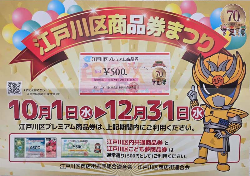江戶川區商品券節將於10月1日開幕。這些商品券價格優惠,可享20%的折扣。有效期限至12月31日。持有商品券的顧客可在參與活動的店舖使用。