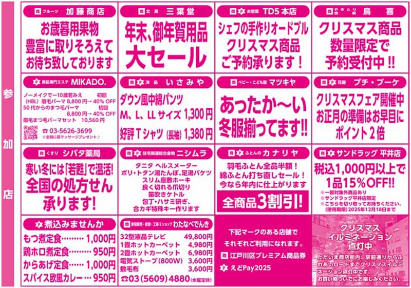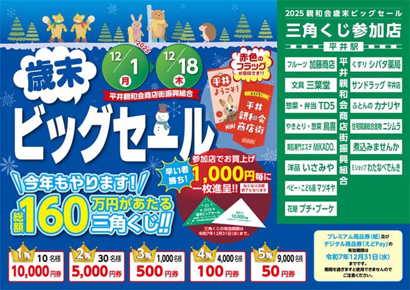 即日起至12月18日,平井新和會商店街將舉辦「年末大促銷」。凡消費滿1000日元,即可獲贈一張總獎金高達160萬日元的三角彩票,最高獎金可達1萬日元。另外,還有更多優惠活動!歡迎蒞臨平井站南口的商店街。