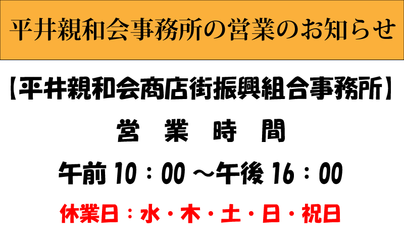 今後、地域の皆様へのサービス向上のため、ホームページの改善やコンテンツの充実に努めてまいりますので、なにとぞ、平井親和会商店街のホームページをご活用いただけますようお願い申し上げます 。